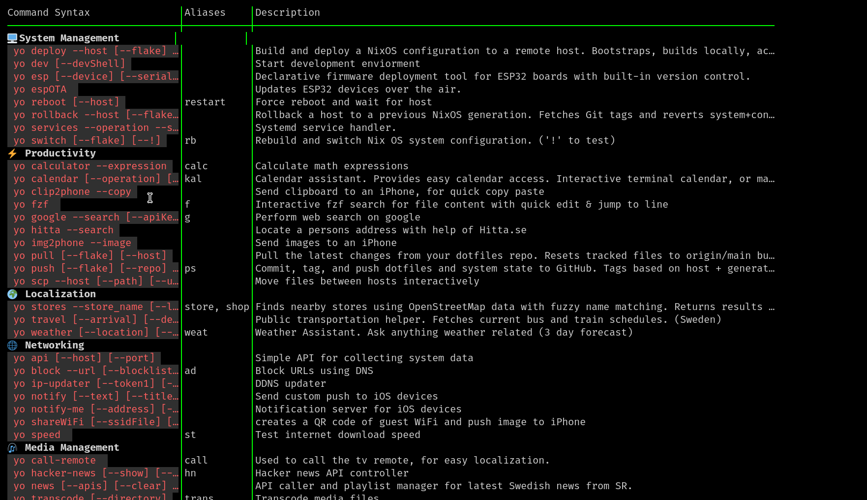 { # 🦆says⮞yo! letz do a script yo! config, lib, pkgs, cmdHelpers, # 🦆says⮞shared functionz (/bin/helpers.nix) ... } : let in { # 🦆says⮞qwack yo = { scripts = { bed = { # 🦆says⮞plx pick da script name description = "Bed controller"; # 🦆says⮞for da --help cmd in da terminal md table & README markdown table category = "🛖 Home Automation"; autoStart = false; # 🦆says⮞run bed@boot? runEvery = []; # 🦆says⮞periodic start (minutes) runAt = []; # 🦆says⮞scheduled start (list of strings - "HH:MM" 24h format) logLevel = "INFO"; # 🦆says⮞duckTrace loggin' parameters = [ { # 🦆says⮞paramz haz extensive validation name = "part"; description = "Which part of the bed (head/feet)"; type = "string"; values = [ # 🦆says⮞doez not run if $part is something else than "feet" "head" ]; default = "head"; # 🦆says⮞if --part iz omitted default value iz uzed for --part } { name = "state"; description = "Move up or down"; type = "string"; values = [ "down" "up" ]; default = "up"; } ]; helpFooter = '' echo "🦆says⮞extra code to be ran and displayed in da scripts --help cmd" ''; code = '' ${cmdHelpers} # 🦆says⮞load da shared functionz yo dt_debug "Sending bed $part $down" # 🦆says⮞ duckTrace logging # 🦆says⮞ rezt of da script code ''; voice = { # 🦆says⮞enabled by default if sentences are defined priority = 2; # 🦆says⮞1-5 (5 lowest) fuzzy = { enable = true; # 🦆says⮞ enabled by default if sentences are defined threashhold = 15; # 🦆says⮞set a script specific fuzzy threashhold }; sentences = [ # 🦆says⮞ [these|words] are optiional & can be omitted # 🦆says⮞ (these|words) are alternatives - u have to say one of them # 🦆says⮞ {this} word is a parameter (must match BOTH scripts parameter AND entity list "[send|control] bed[s] {part} {state}" "(take|send|control) {state] [the] bed[s] {part}" ]; lists = { # 🦆says⮞ entity lists part.wildcard = false; # 🦆says⮞ entities can be wildcards (anything) part.values = [ { # 🦆says⮞ if u say one of these words "in" = "[head|heads|bedhead|top]"; out = "head"; # 🦆says⮞ it becomes this word } { "in" = "[foot|foots|feet|feets]"; out = "feet"; } ]; state.values = [ { "in" = "[up|upp]"; out = "up"; } { "in" = "[down|downs]"; out = "down"; } ]; }; }; }; }; };}